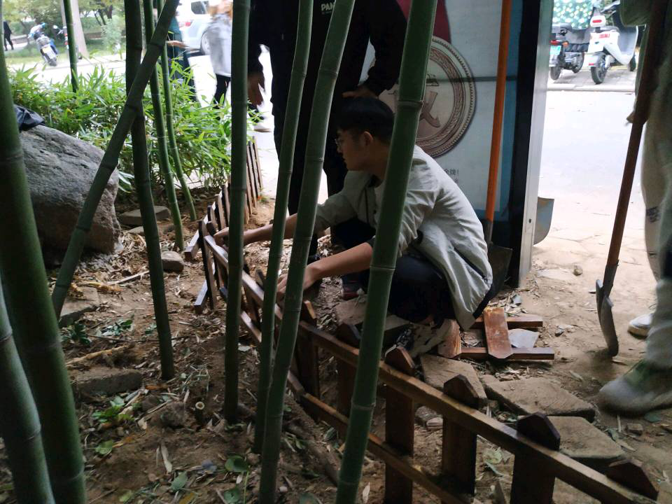 劳动实践过程中,班级师生齐心协力、分工合作对二号楼前的两处竹林绿地进行了整理改造。师生结合专业对竹林的地形进行平整,疏松土壤,播撒肥料,安插篱笆,清扫垃圾和落叶,对老株残株进行修剪。在师生共同努力下,使竹林绿地疏密有致,风貌焕然一新,愈加生机勃勃。