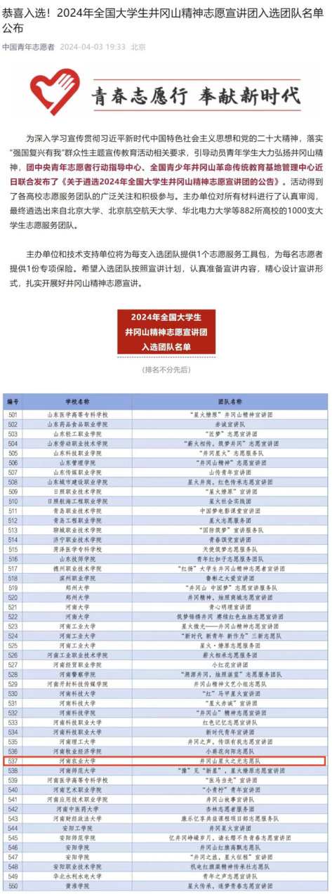 井冈山星火之光志愿队成功入选,是此次志愿宣讲招募活动中我校唯一一支入选团队。