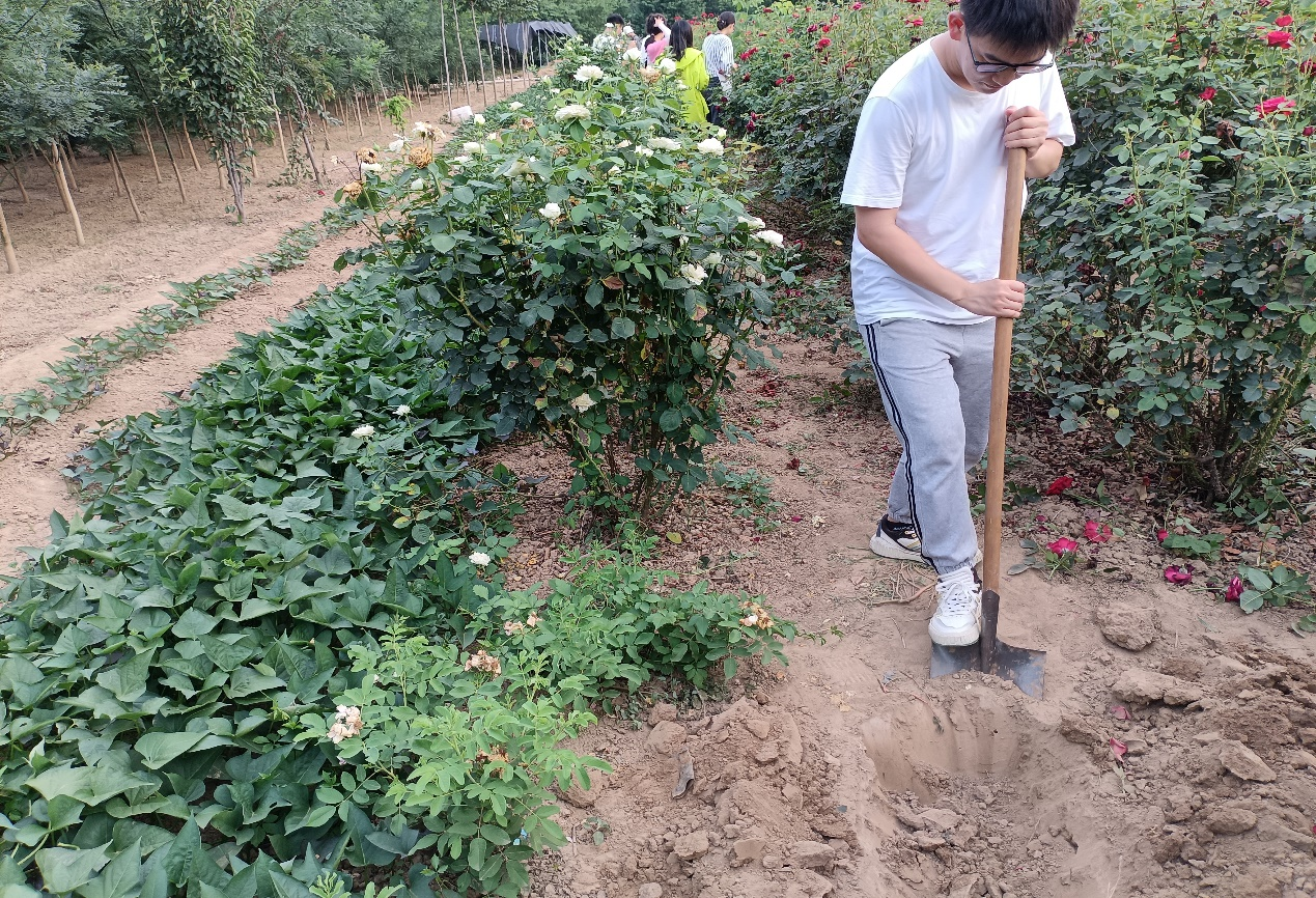 活动伊始,王政老师与园区内负责人一同向学生们讲解月季枝叶修剪流程。随后,学生们迅速投入了“战斗”之中,他们对月季枯枝与生芽枝叶进行修剪,并将剪落的枝叶聚在一起,集中清理。接着团队成员拿起铲子进行翻土垒墙,为施肥浇水做好充分准备,最后,在工作人员的指导下,进行施肥以及水管灌溉田地。通过团队成员的不懈地努力,圆满完成了一系列修剪工作。