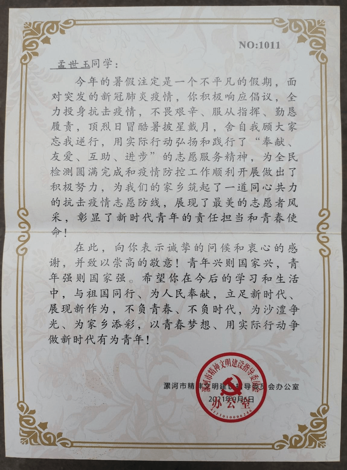 他迅速响应村委会号召,投身防疫工作一线,协助村干部开展体温检测和疫情防控知识宣传。同时,孟世玉还利用工余时间编写村民防疫传单和积极给村民普及相关知识,受到村民好评和漯河市文明办的肯定。志愿期间,他认真对待工作,尽职尽责地做好防疫前线的工作。他表示,坚持做好疫情防控常态化的工作,这是一件关乎每个人健康的大事,自己作为一名新时代青年也想贡献一份力量。