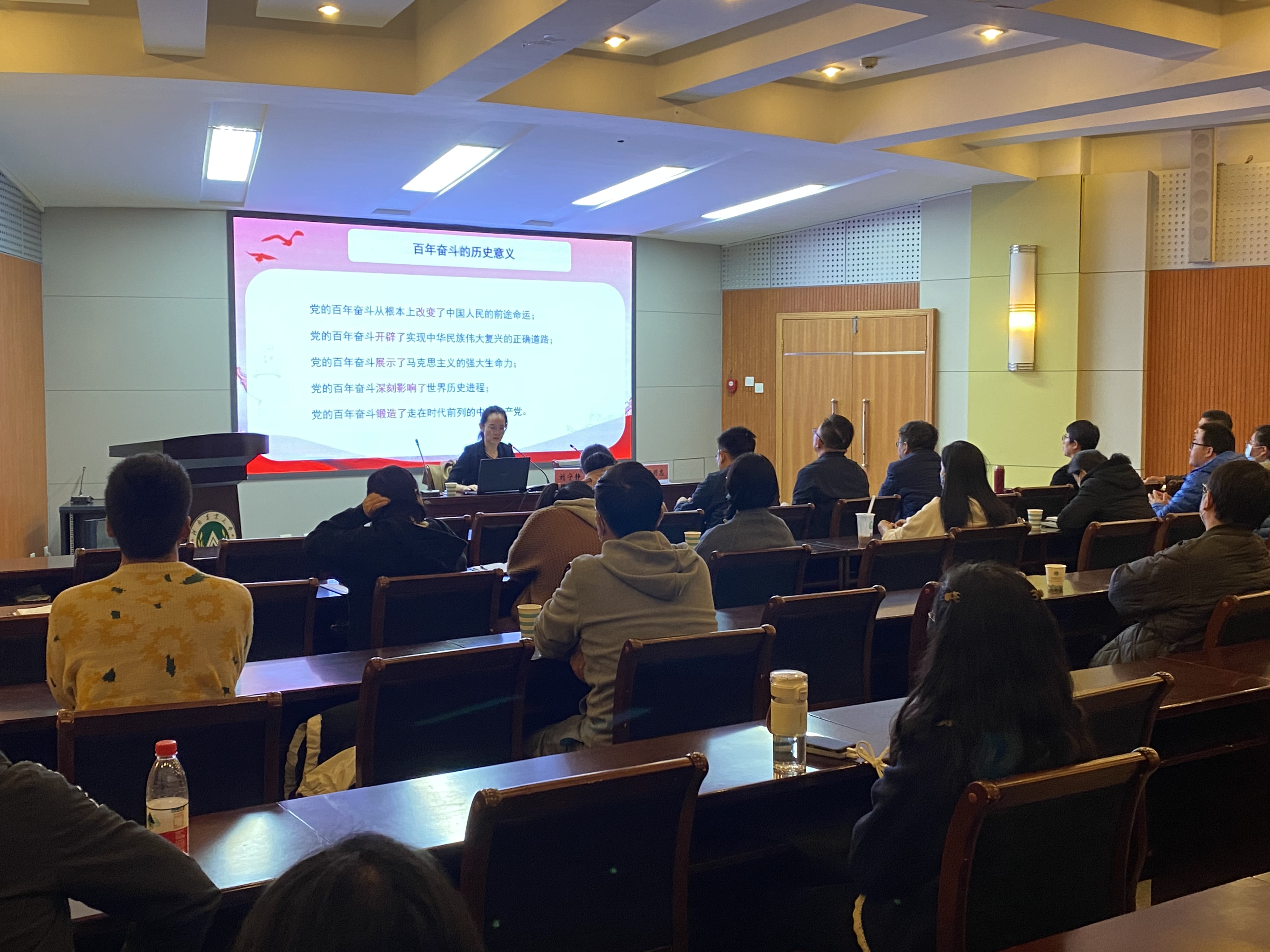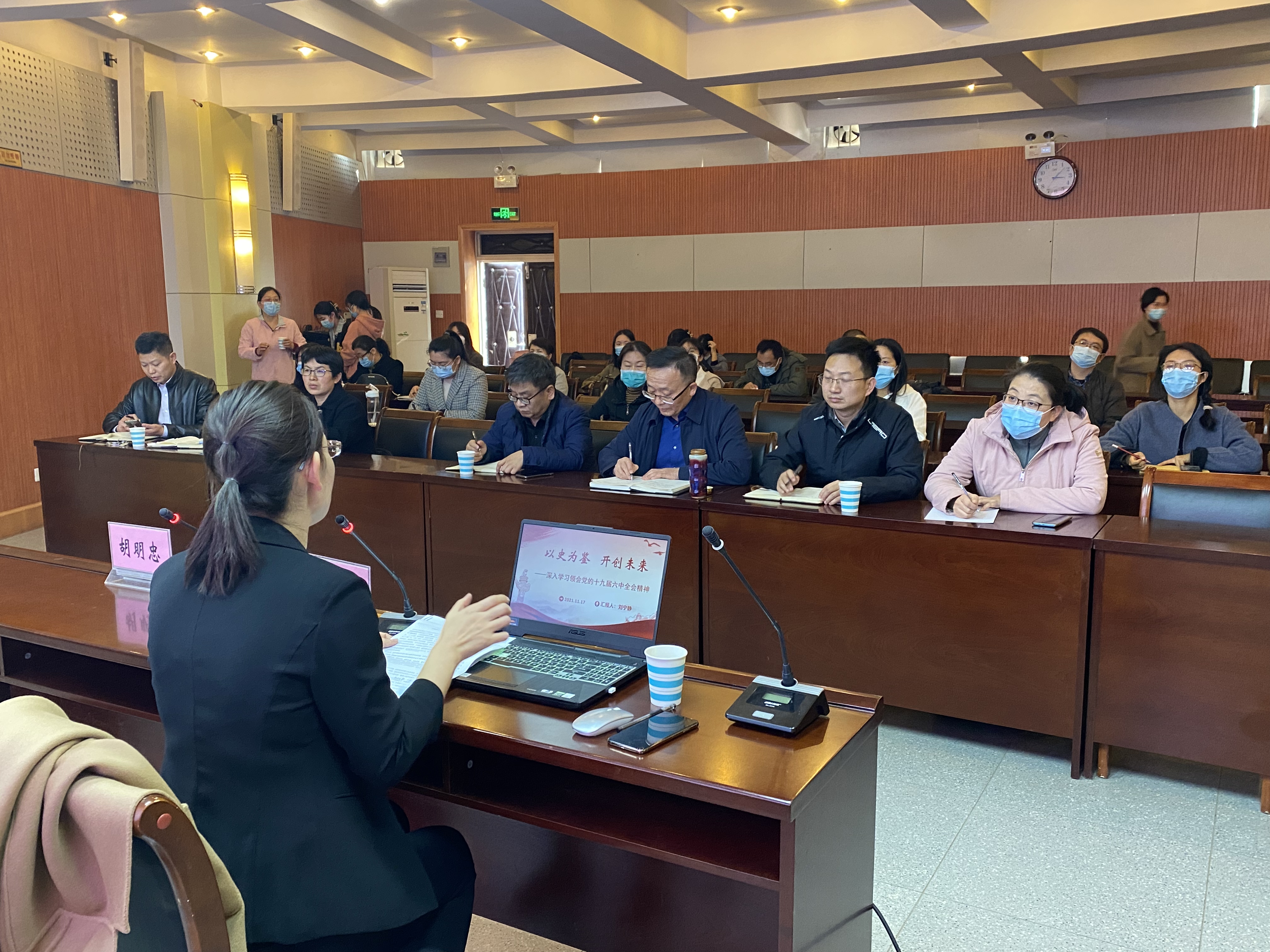 报告中,刘宁静围绕“全会召开的时间节点”、“全会完成的主要工作”、“《历史决议》的主要精神”、“原原本本学习全会文献精神”四个方面领学了党的十九届六中全会精神要点。深入浅出地解读了十九届六中全会的基本背景和重大意义、十九届六中全会的主要精神和创新提法、确保新时代新征程行稳致远的必须与坚持。她指出,党的十九届六中全会是在我们党成立一百周年的重要历史时刻,在党和人民胜利实现第一个百年奋斗目标、全面建成小康社会,正向着第二个百年奋斗目标迈进的重大历史关头召开的重要会议,在党的历史上具有重要的里程碑意义。她希望师生在学习中把握好十九届六中全会精神精髓,深刻领会“两个确立”对新时代党和国家事业发展、对推进中华民族伟大复兴历史进程的决定性意义,深刻理解习近平新时代中国特色社会主义思想实现了马克思主义中国化的历史性飞跃和创造性升华的重要内涵。