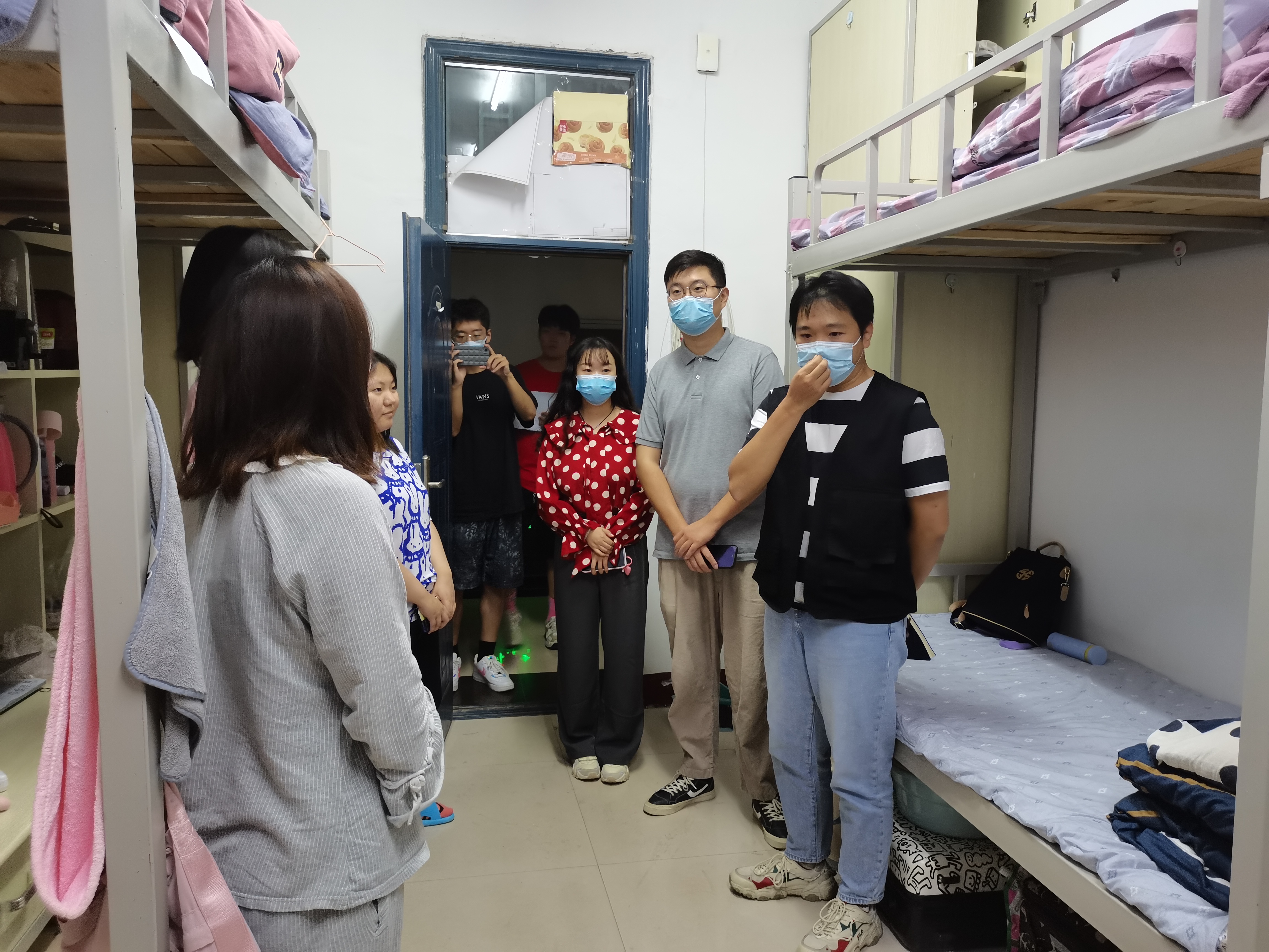 到达学生宿舍后,李雨澍询问了学生们的住宿感受,并查看了宿舍内水电供暖情况,叮嘱学生要注意宿舍用电安全,避免发生用电起火等情况;要做好宿舍消杀工作,定期通风,做好个人防护。史玥认真检查了宿舍卫生情况,要求学生们要定期清扫宿舍,减少杂物堆放,禁止在宿舍内饲养宠物,吸烟喝酒,养成良好的生活习惯。马焱在与学生的交流过程中,了解了学生们的国庆假期安排,提醒学生们疫情期间外出一定要做好个人防护,在学习生活上遇到任何问题要及时寻求辅导员、班主任的帮助。芦嘉俊与学生们的在学习进展和心理状态方面进行了沟通交流,勉励学生们珍惜学习时光,以积极、健康的面貌融入到新学期的学习与生活中。