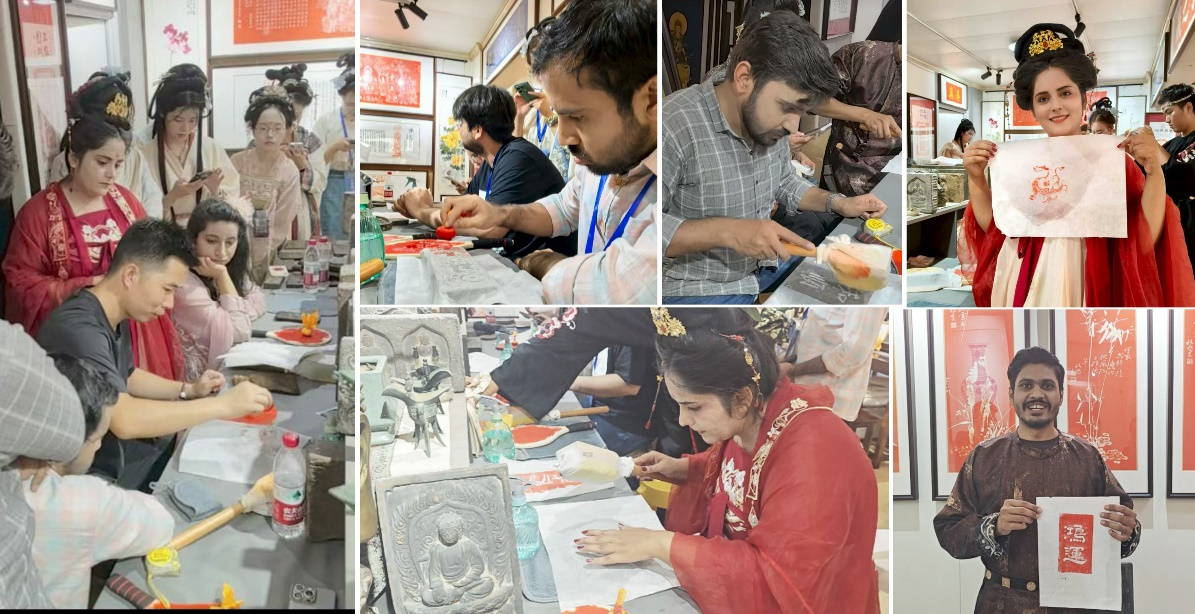 在洛邑古城文化考察环节,留学生实地调研盛唐时期城市格局与园林艺术特征,直观感受洛阳的历史文化底蕴;在金石拓片非遗实践课上,留学生在专业指导下动手操作,深刻体会传统金石学的严谨性及拓片技术在文物信息保存、历史文化传播中的核心价值。