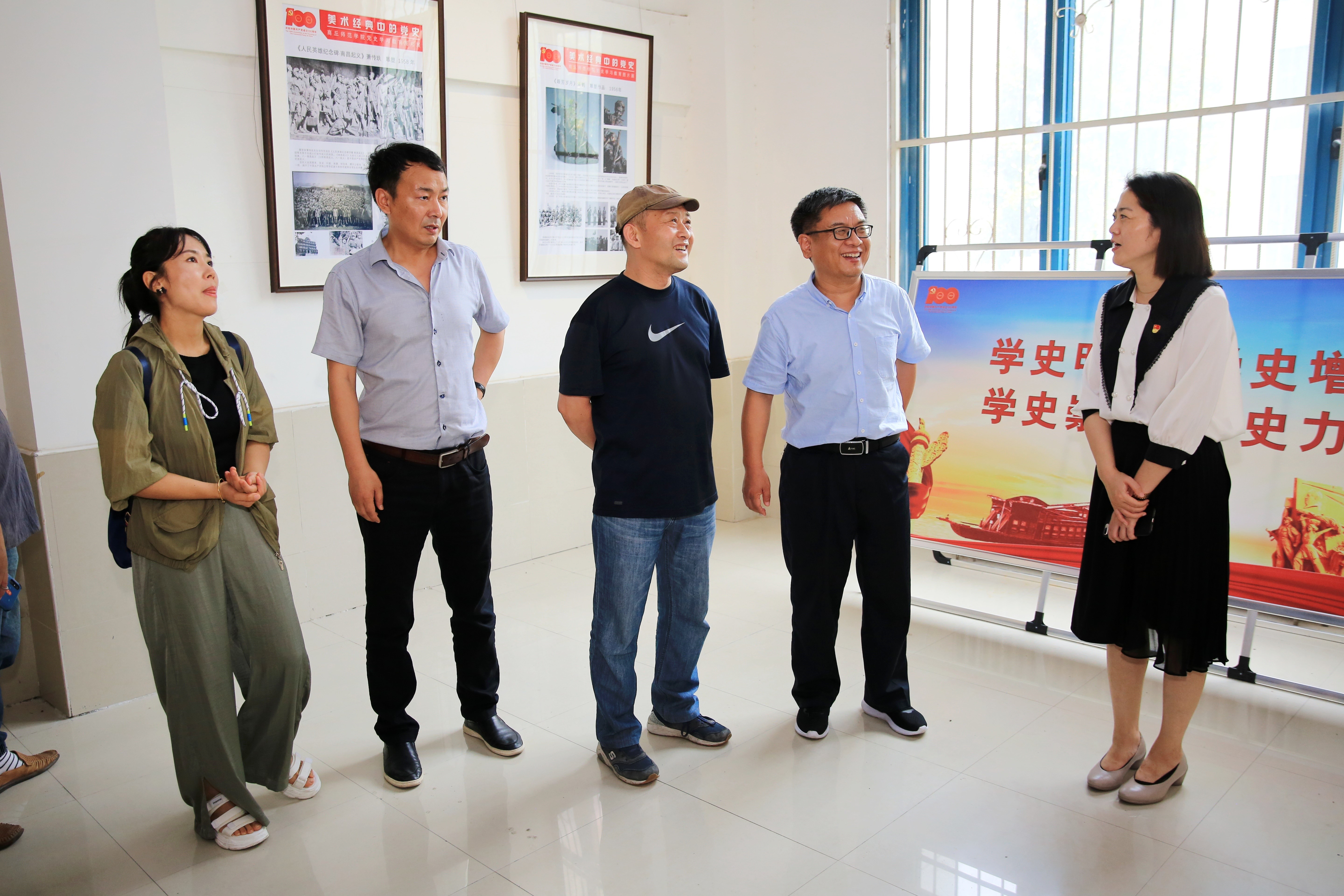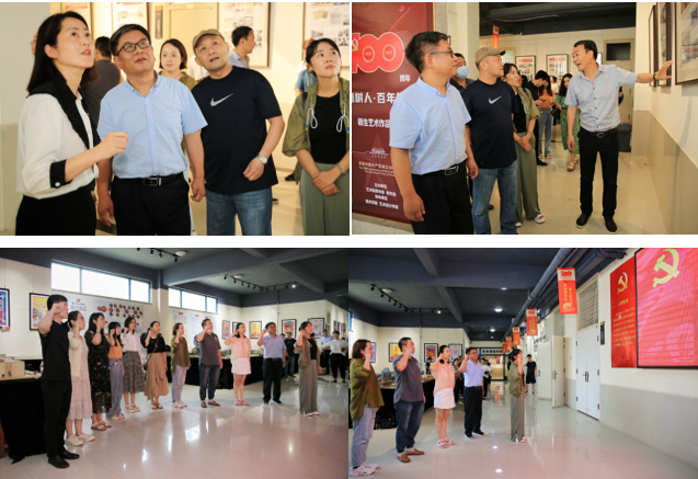 活动第二项:回望历史——商丘师范麻将online 艺术设计麻将online 党委书记杨莹莹、院长朱长征、副院长苏世昌、任然等陪同阴予兴一行在商丘美术馆参观学习了《党史学习教育图片展》,并在展厅外的党旗下,举行了重温入党誓词的党日活动。