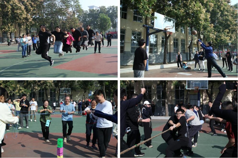 在教工竞赛场地,首先点燃老师们运动热情的是“活力大跳绳”,参赛教师同心协力、步调一致、奋勇争先。随后,“合力搭建”、“齐心协力”项目中老师们团结协作,尽显英姿。拔河项目中,参赛师生更是拼尽全力投入比赛,观战的同学们纷纷加油助威。赛场旁,加油声、欢笑声、喝彩声不断,热闹非凡。