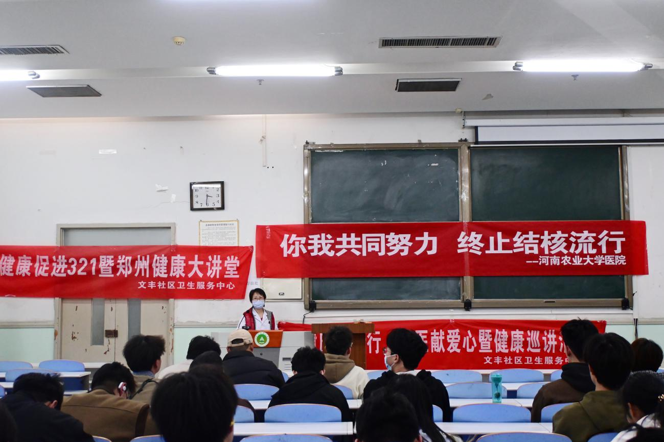 特邀第九人民医院呼吸内科主任方天舒于文化路校区工程楼103教室举办“你我共同努力,终止结核流行”春季传染病预防宣讲会,各年级班长支书、全体宿舍长参加会议。