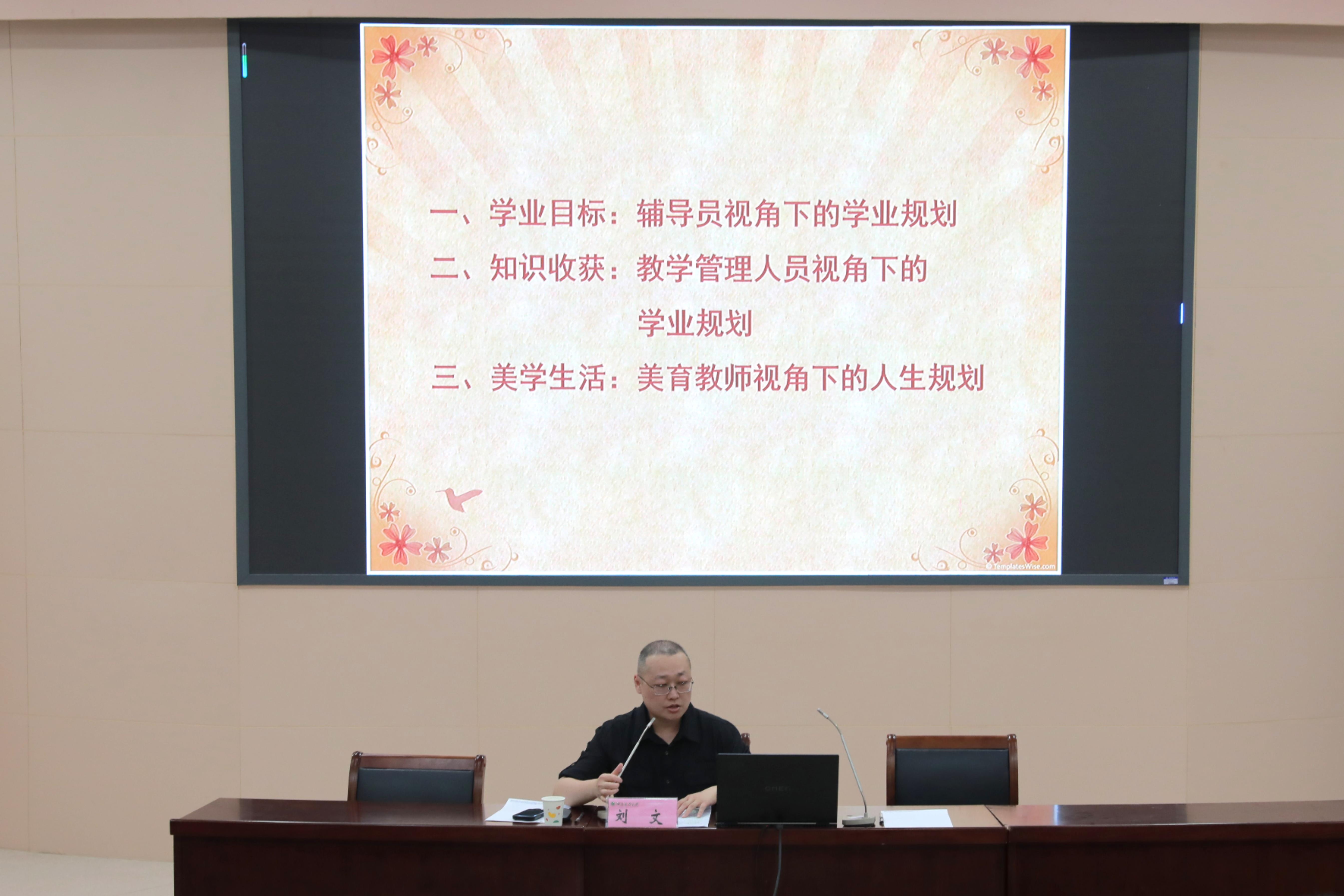 会议伊始,刘文从学业目标、知识收获、美学生活三个方面系统性地分享了自身心得,分别从辅导员、教学管理人员、美育教师三个视角分析如何进行良好的人生规划。祁飞详细讲述了成为公务员必要的前期准备,强调了考公在当下就业市场中的吸引力和发展前景,同时结合自身任职经历为学生进行更进一步的讲解。