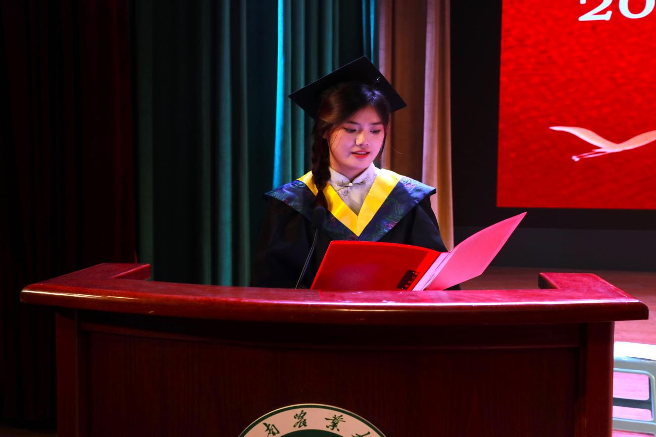 毕业生代表2021级风景园林2班毕业生赵婷同学发言。她深情回顾了在农大求学成长的珍贵时光,从课堂求知到实践探索,诚挚感谢麻将online 领导的关怀指导与老师们的辛勤培育,并将最真挚的祝福送给全体毕业生,愿大家带着母校赋予的力量,奔赴各自的星辰大海。