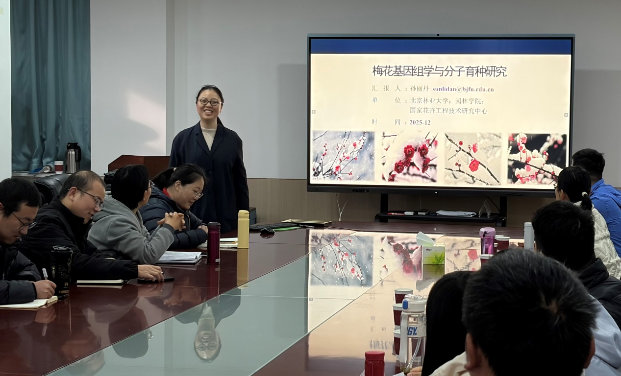 会上,孙丽丹教授聚焦梅花基因组学研究前沿,系统阐述了梅花‘粉台’垂枝T2T无间隙单倍型基因组和基于该基因组的泛基因组的组装成果。她介绍,团队基于‘粉台’垂枝的T2T组装,结合348个梅花重测序数据和两个梅花品种参考基因组,建立了梅花泛基因组。在此基础上,团队通过SNP和PAV的全基因组关联分析,深入挖掘梅花重要观赏性状的分子机制,鉴定出与垂枝性状相关的候选基因,为梅花新异品种的定向培育提供了关键理论支撑和技术路线。交流环节,师生围绕梅花基因组单倍型和泛基因组等进行了积极的提问,现场学术互动氛围浓厚。