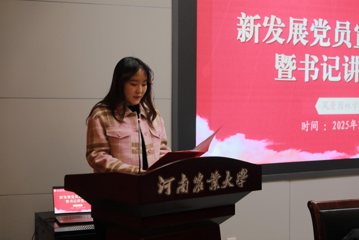 张怡雪作为学生党员代表发言。她结合自身成长经历,与新党员分享了三点感悟:一是要坚定理想信念,做“心中有光”的追梦者,将“绿水青山就是金山银山”理念融入专业实践;二是要练就过硬本领,做“脚下有路”的实干者,在生态修复、乡村振兴等领域深耕细研;三是要勇于担当奉献,做“肩上有责”的践行者,在服务师生、奉献集体中擦亮党员名片。